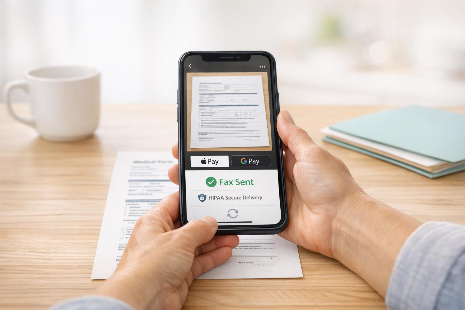 Fast, no-account pay-per-fax for caregivers and occasional users: mobile scanning, Apple/Google Pay, automatic retries, and optional HIPAA-secure delivery.